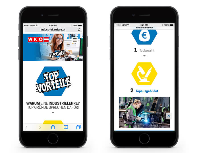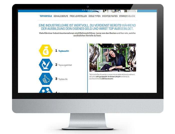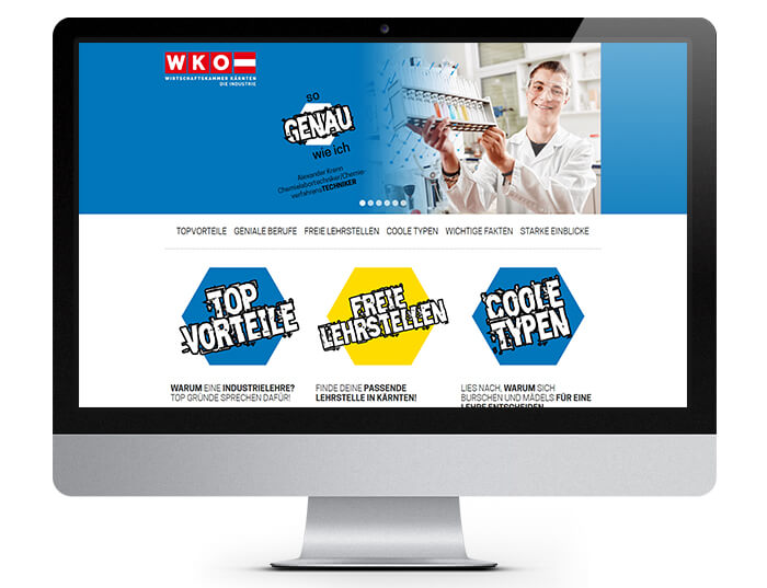 Responisve Website für die Kampagne „Lehrlinge in der Kärntner Industrie“. Integration von YouTube Videos, Testimonials und der Lehrstellen-Datenbank der Wirtschaftskammer. Online-Kampagne zur Erreichung der Zielgruppen Jugendliche und Erziehungsberechtigte.